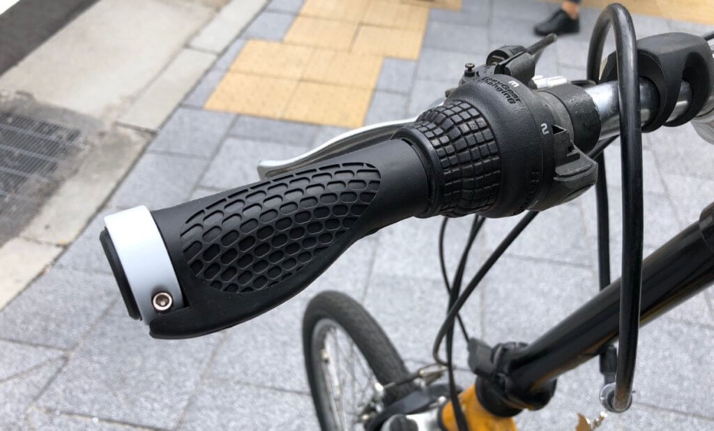 グリップエンドがL字になっていて、バーエンドバーを装着しているみたいな感じになります。